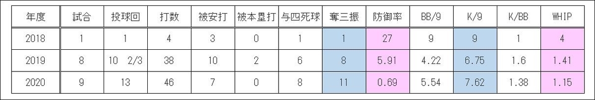 今シーズン、まだ登板回数が多くないとはいえ、ファームでの防御率は0点台を維持している。その要因として、入団初年から年々、被安打数が減少し、それに伴いイニング当たりに背負う走者数が減少(WHIPの指数が良化)しており(次表のピンク色部分)、また、奪三振率が改善している(次表の水色部分)。やや四死球の数が多めであるが、それでもK/BB(奪三振数÷与四球数)の数値は良化しつつあり、課題のコントロールにも改善がみられる。